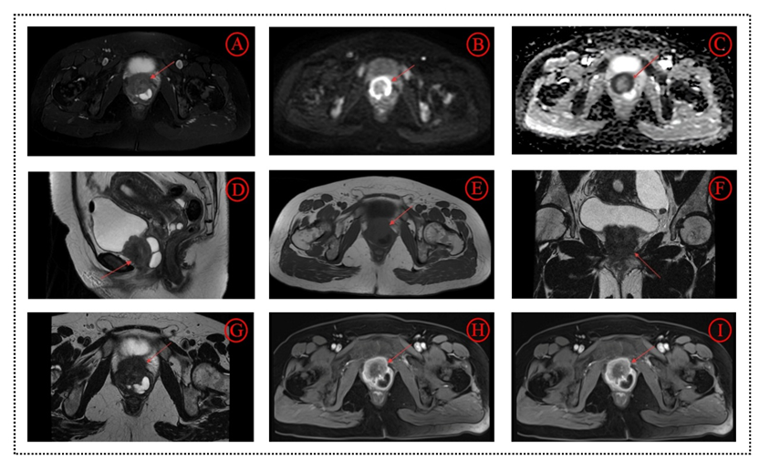 This case report presents a 43-year-old female with primary perineural neuroendocrine carcinoma (NEC) of the urethra, an exceptionally rare malignancy accounting for less than 0.5% of urinary tract tumours. The patient presented with dysuria and pain, initially misdiagnosed as a urinary tract infection. Imaging revealed a urethral mass with cystic changes posteriorly, showing heterogeneous enhancement with a characteristic “target sign” on MRI and restricted diffusion on DWI, correlating with high Ki-67 expression (70%). Histopathological and immunohistochemical findings confirmed large-cell neuroendocrine carcinoma. This case provides comprehensive CT and MRI imaging features aiding in early diagnosis and differential diagnosis from more common urethral carcinomas.