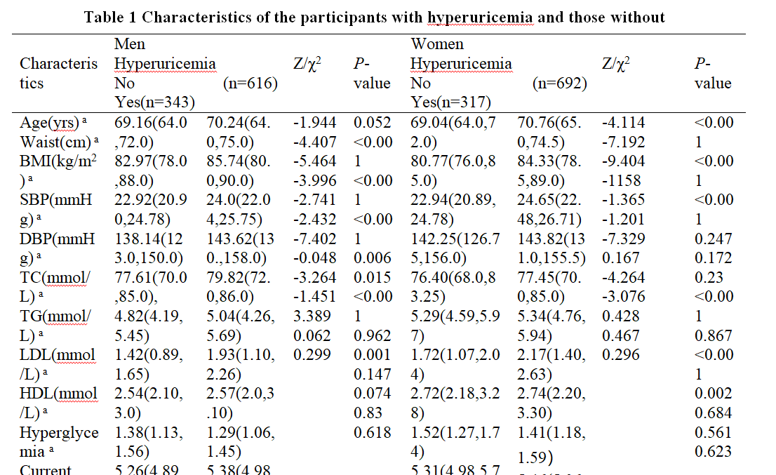 Methods: A cross sectional study was conducted in a representative urban area of Hangzhou in 2023. A two-stage stratified clustering sampling method was used and 1998 elderly participants were included. Overnight fasting blood samples were taken to determine serum uric acid, cholesterol, triglyceride, low density lipoprotein, high density lipoprotein, γ-glutamyl transpeptidase and other biochemical indexes. Demographic and clinical variables, including body mass index (BMI/height2), waist-to-hip ratio and blood pressure, were measured and recorded through face-to-face interviews with structured questionnaires.