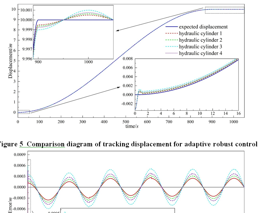 Addressing the challenge of insufficient synchronization accuracy in the four hydraulic cylinders during the lifting and lowering operations of a subsea drilling rig frame, this paper proposes a multi-cylinder synchronous control strategy. This strategy integrates an improved cross-coupling synchronization error, an adaptive parameter law, and sliding mode robust control. A nonlinear dynamic model of the four-cylinder lifting system is established to analyze the interaction mechanism between the coupling forces and displacement errors among the hydraulic cylinders under unbalanced and varying load conditions. On this basis, a sliding mode controller is designed utilizing the cross-coupling error. An adaptive algorithm is introduced to update system parameters online, and a saturation function is employed to suppress sliding mode chattering, thereby enhancing system robustness and synchronization precision. Co-simulations via AMESim and MATLAB/Simulink, along with experimental validation, demonstrate that the proposed control strategy achieves high-precision synchronous motion of the four hydraulic cylinders in both lifting and lowering scenarios. The maximum tracking error is confined to 1.67 mm, and the steady-state error is maintained within 0.48 mm. The strategy effectively mitigates the impact of time-varying loads and external disturbances, significantly improving the stability and reliability of the subsea drilling rig frame during lifting and lowering operations.