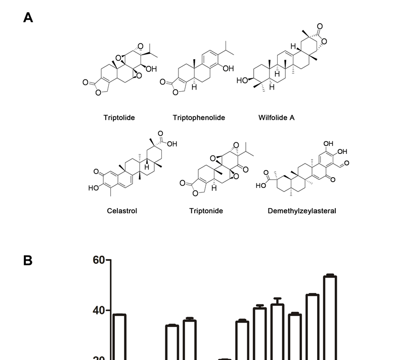 Tat protein, one of human immunodeficiency virus (HIV-1) specifically encoded gene products, plays a crucial role in HIV-1 transcription, which functions as “on and off” switch in HIV-1 latency and activation. Previous study has shown that triptolide (TPL) inhibits HIV-1 replication by promoting proteasomal degradation of Tat protein, but the mechanism of TPL-induced Tat degradation still remains elusive. Here, we compared with other active ingredients extracted from Tripterygium wilfordii, and found that TPL has a better effect on inhibition in HIV-1 transcription in a time and dose dependent manner. Our study indicates that TPL induced Tat degradation in an ubiquitin proteasome pathway, which is neither through blocking CycT1 protection for Tat, nor affecting transcription or translation of Tat. CUL4B is involved in Tat degradation under natural condition while not TPL treatment. Although mass spectrometry shows that TPL induces Tat K19 and K71 ubiquitination, single site mutation of either K19 or K71 as well as other lysine residues does not protect Tat from TPL, except that K41R shows partial resistance to TPL-induced Tat degradation. SILAC (stable isotopic labeling by amino acids in cell culture) analysis indicates that 17 E3 ubiquitin ligases maybe involved in TPL-induced Tat degradation. These findings provide novel insight to block HIV replication by promoting Tat degradation.